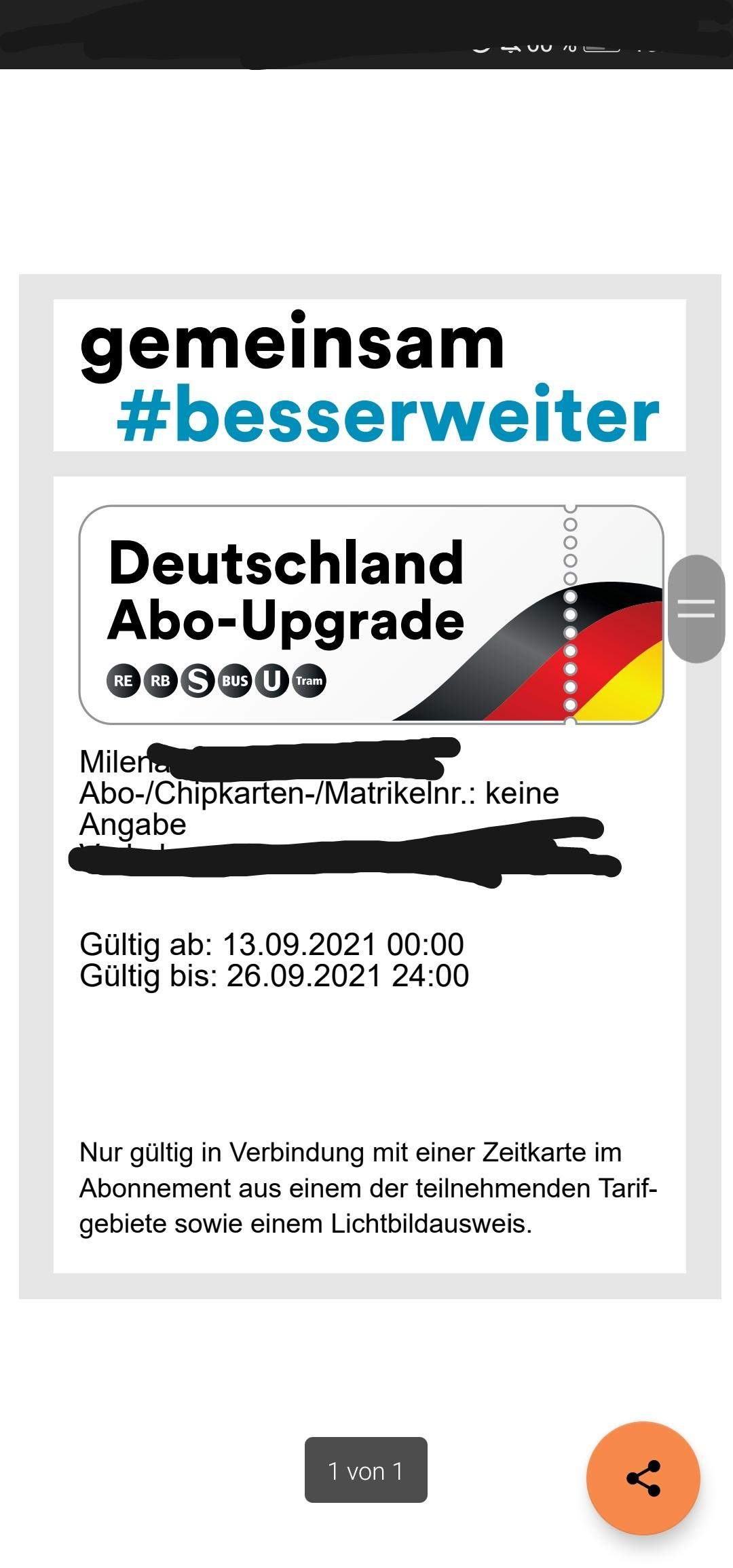 Der Aktionszeitraum beginnt pünktlich zum Start der europäischen Mobilitätswoche am Montag den 13. Ihre eure Fahrtberechtigung zum Deutschland Abo-Upgrade ist bei einer Kontrolle entweder als Papierausdruck oder als PDF-Datei auf einem mobilen Endgerät vorzuzeigen. Um uns bei den Abo-Kunden zu bedanken die trotz der Corona-Pandemie ihr Abonnement nicht gekündigt haben erweitern wir gemeinsam mit anderen Verkehrsunternehmen und -verbünden in Deutschland die Gültigkeit der Abos.